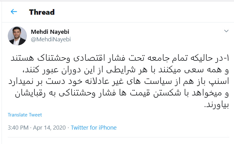 او در ادامه افزود: «این سیاستگذاری از این نظر نادرست است که قشر کارگر جامعه یعنی پیک موتوریها نادیده گرفته میشوند، آنها در این شرایط سخت درست به مانند کادر درمانی و دیگر اعضای جامعه برای بقای زندگی خود و مابقی انسانها تلاش میکنند و خدمات را به مردم ارائه میدهند، با پایین آوردن قیمتها از حد نرمال، تنها سفره آنها کوچکتر خواهد شد. این افراد حق اعتراض هم ندارند زیرا با توجه به شرایط چارهای دیگر بهجز پذیرفتن نیست. آنها مجبور به قبول درخواستهای کم هزینه میشوند و آن را بهتر از تعطیلی میدانند.»