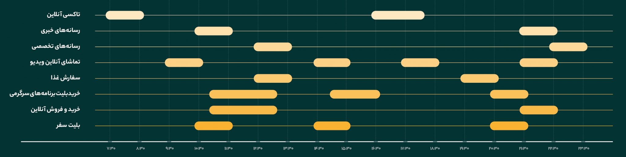 طبق این گزارش، در نمودار ترافیک وبسایتها، سفارش آنلاین غذا و تاکسیهای آنلاین غذا تا یک سوم کاهش و خرید بلیت سفر و برنامههای سرگرمی بهترتیب یکچهارم و یکپنجم با کاهش روبرو شدهاند. این در حالی است که سوپرمارکتهای آنلاین و سرویسهای تماشای آنلاین ویدیو رشد 2 برابری داشتهاند.
