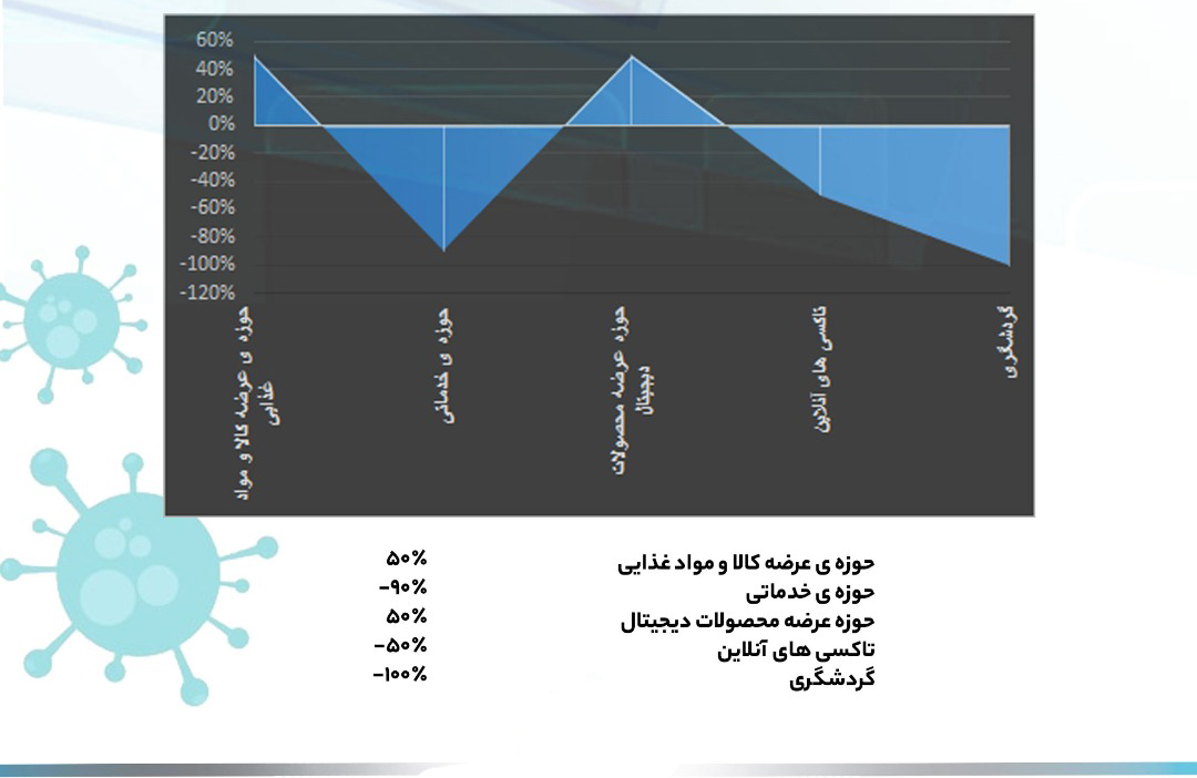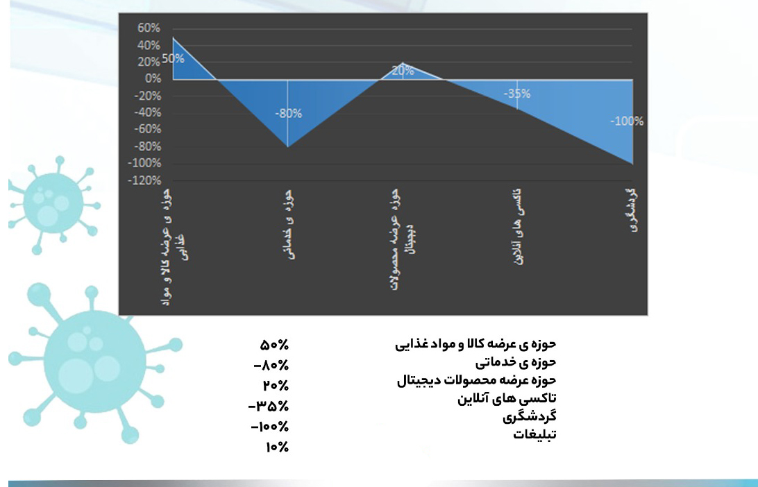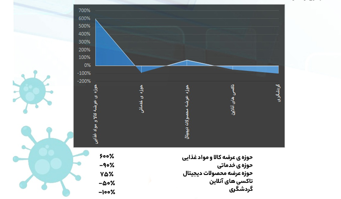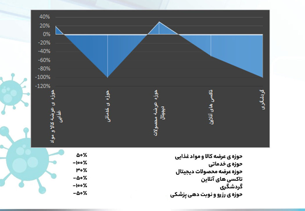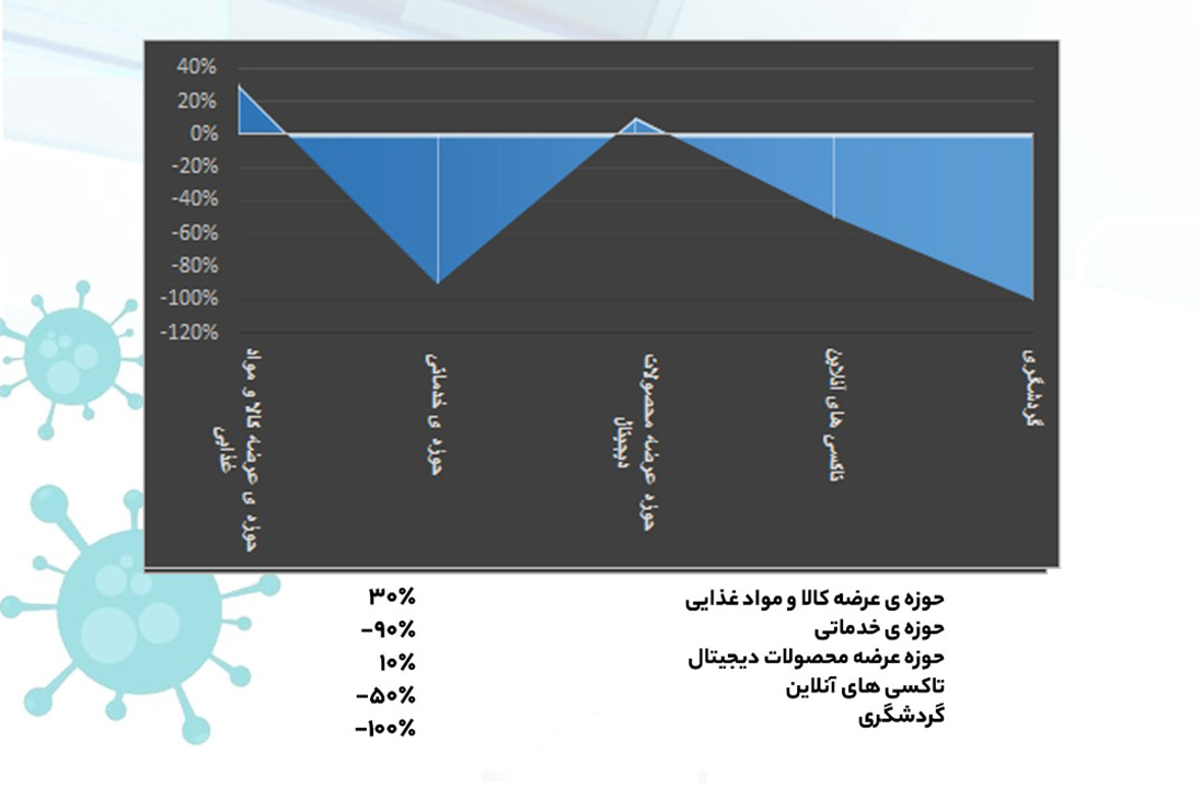 این گزارش که شامل کسب و کارهای شهرهایی چون اصفهان، مشهد، یزد، خوزستان و شیراز میشود نشان میدهد که حوزههایی مانند عرضه کالا و مواد غذایی، عرضه لوازم دیجیتال، مشاوره پزشکی، ویدئو و رسانه، خرید آنلاین بلیط و رویداد آنلاین با افزایش حجم سفارشات روبرو بودند و توانستد در این ایام به مردم خدمترسانی کنند. اما کسب و کارهای حوزههای خدماتی، گردشگری ، تاکسی آنلاین، تبلیغات آنلاین، مسکن و سفارش آنلاین غذا با کاهش چشمگیری از حجم سفارشات روبرو بودند که بسیاری از آنها مجبور به تعدیل نیرو و یا در بعضی از شهرها تعطیلی کسب و کارشان شدند.