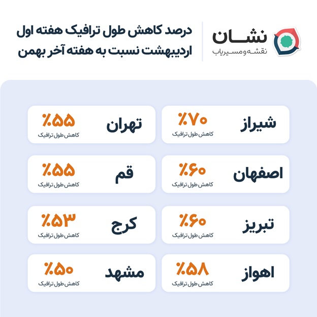 بر این اساس شهر شیراز با ۷۰ درصد کاهش ترافیک، بیشترین میزان کاهش طول ترافیک به نسبت بهمنماه را داشته و شهر مشهد با ۵۰ درصد، کمترین کاهش را تجربه کرده است. در شهر تهران، طول ترافیک ۵۵ درصد کاهش داشته است. در شهرهای دیگر این میزان متغیر بوده اما نکته مهم اینجاست که تمام کلانشهرهای کشور دست کم ۵۰ درصد کاهش ترافیک داشتهاند.