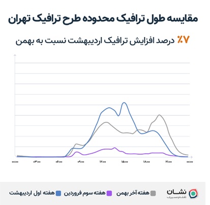 بر اساس دومین گزارش نشان، ترافیک شهری همچنان بسیار پایینتر نسبت به ایام قبل از شیوع ویروس کرونا است و ۵۷ درصد از ترافیک خیابانها نسبت به بهمنماه کاسته شده است. در نموداری که نشان منتشر ساخته، کمترین میزان ترافیک در کشور در فروردین ماه رخ داده و با شروع اردیبهشت ماه، ترافیک کمی بیشتر شده اما کماکان فاصله زیادی نسبت به میزان ترافیک در پیش از شیوع کرونا دارد؛ فاصلهای که به ۵۷ درصد در سراسر ایران میرسد.
