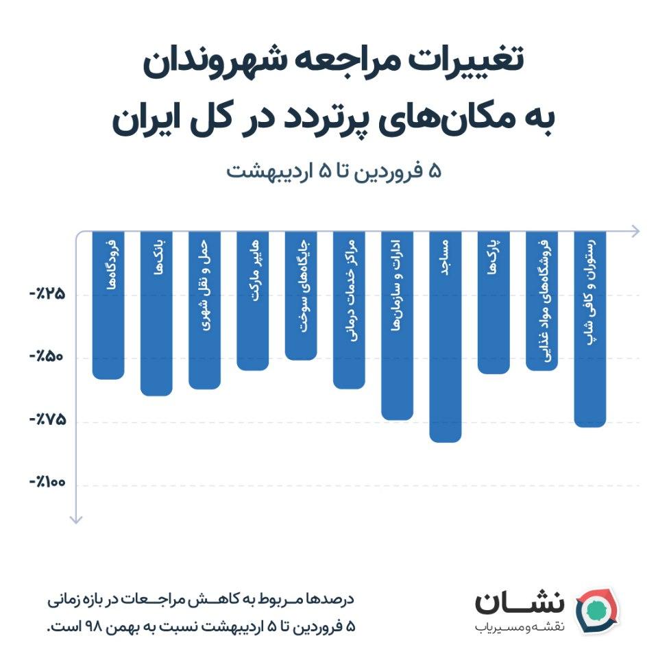 در بازه زمانی ۲۰ اسفند تا ۲۰ فروردین ماه، بررسی میکرد که سهم تردد شهروندان به چه نقاط مهمی و تا چه میزان در مقایسه با پیش از آغاز کرونا کاهش پیدا کرده است. در گزارش جدید که در این لینک قابل مشاهده است؛ علاوه بر بررسی میزان مراجعه به نقاط پرتردد در کشور و ۹ کلانشهر ایران، مجددا این بخش را در بازه زمانی ۵ فروردین تا ۵ اردیبهشت بررسی کرده است. در این نسخه از گزارش هم مانند گزارش ویرایش اول مساجد، ادارات و سازمانها و نهایتاً رستورانها و کافیشاپها با کاهش مراجعه حدوداً ۷۵ درصدی نسبت به بهمن ۹۸ مواجه هستند و تغییرات خاصی در این بخش مشاهده نمیشود.