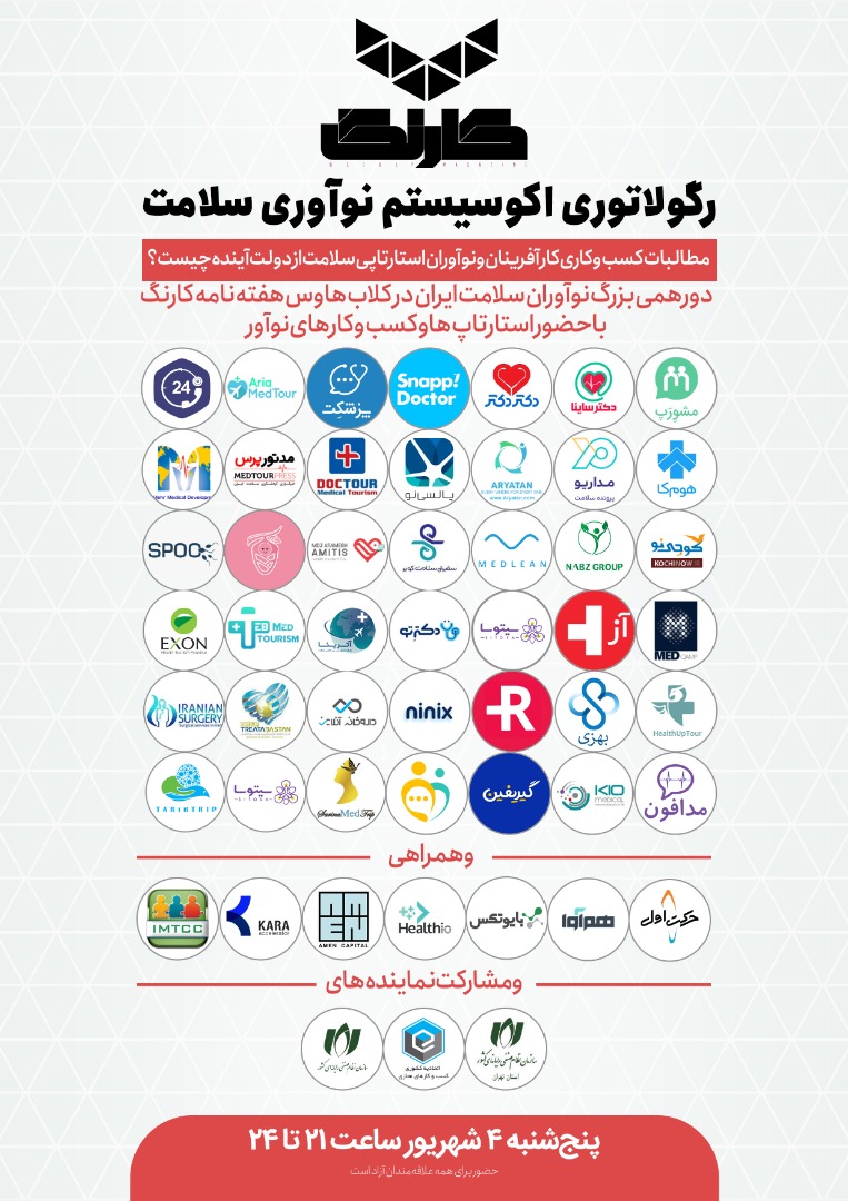 هفتهنامه کارنگ با همراهی اکوسیستم نوآوری سلامت کشور از جمله استارتاپها، سرمایهگذارها، مراکز نوآوری و برخی چهرههای صنفی و سیاستگذاری حوزه نوآوری و سلامت، دورهمی بزرگ کسبوکارهای این حوزه را برگزار میکند.